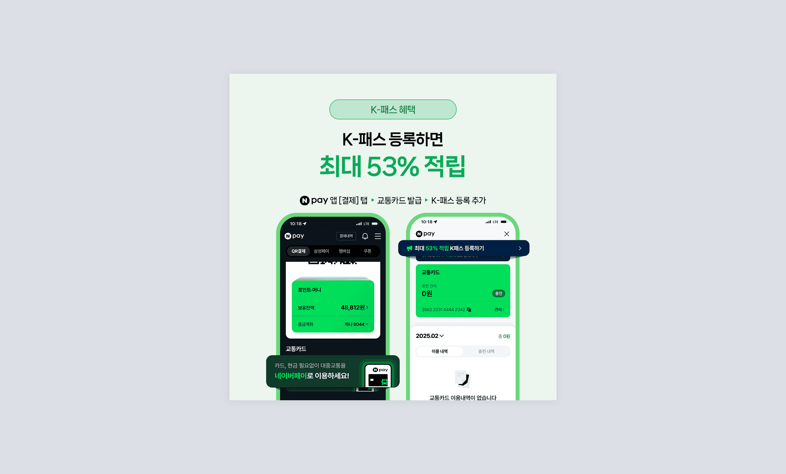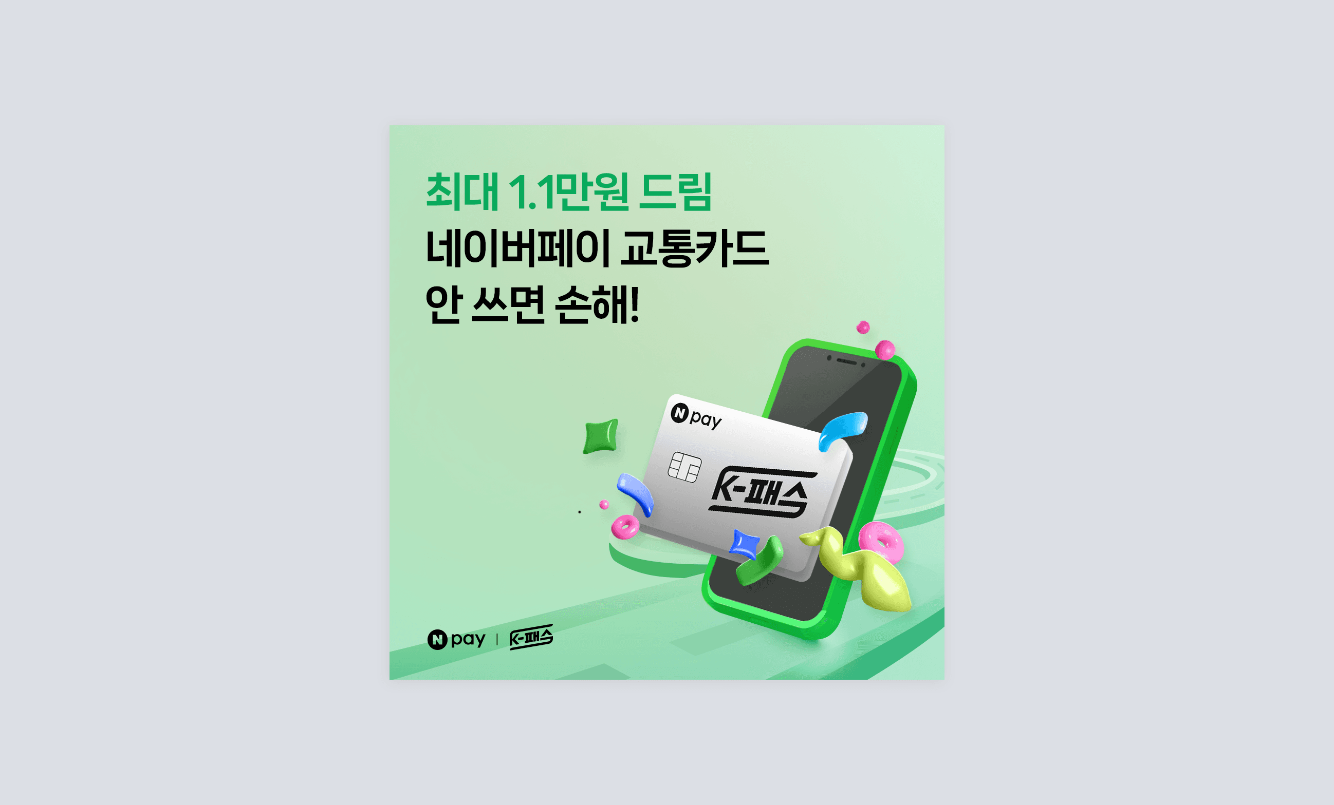 네이버페이의 정체성을 강화하는 미니멀한 그래픽 언어와 전략적인 레이아웃으로 브랜드 몰입감을 높이고 콘텐츠 도달률 최적화에 기여하였습니다